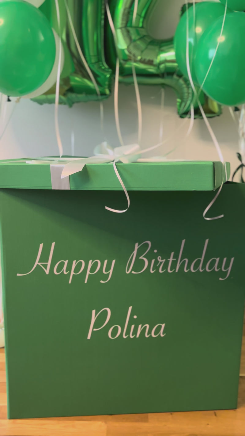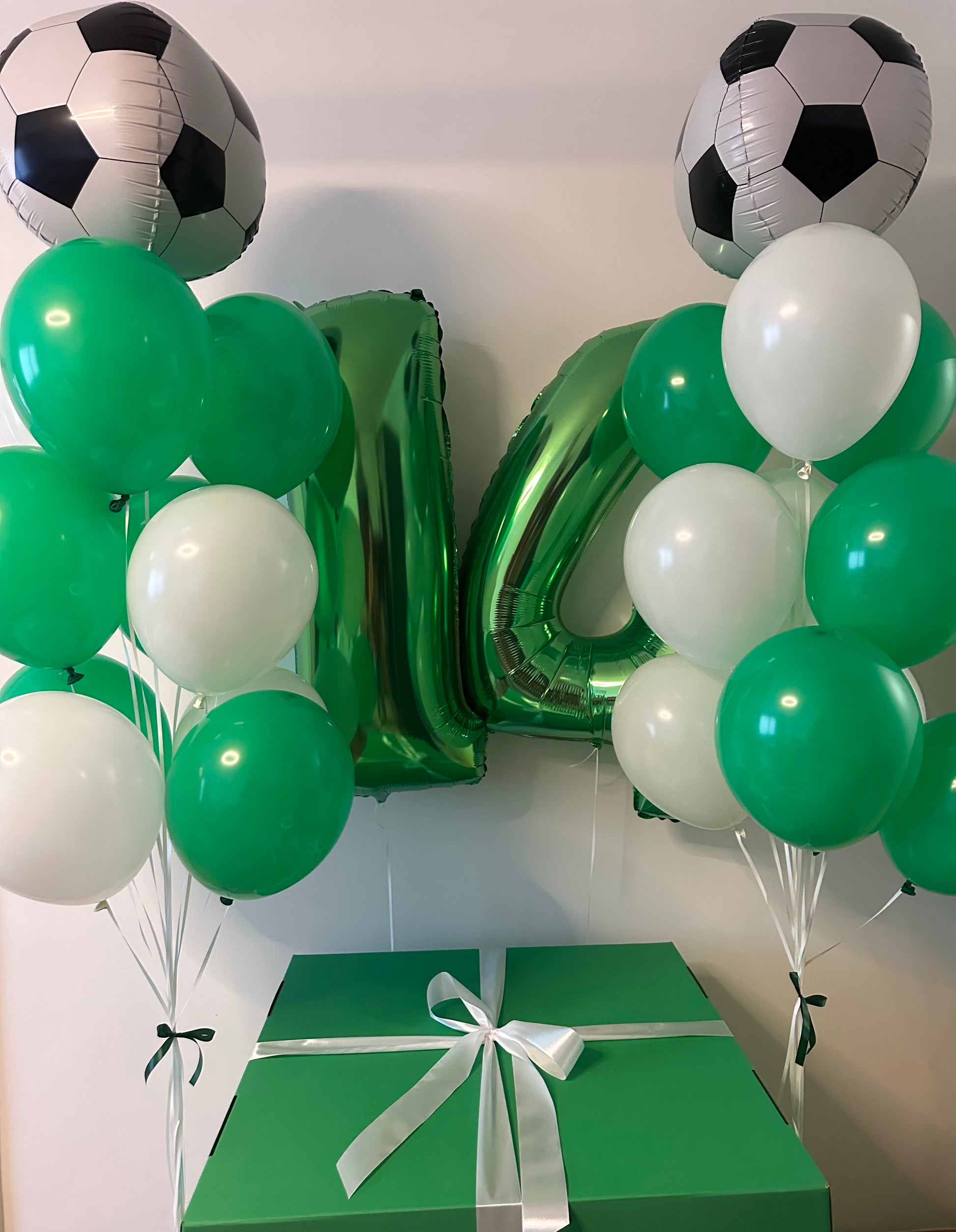 Surprise box with 10 balloons inside, 2 sets with each 10 latex balloons and one foil ball, 2 numbers