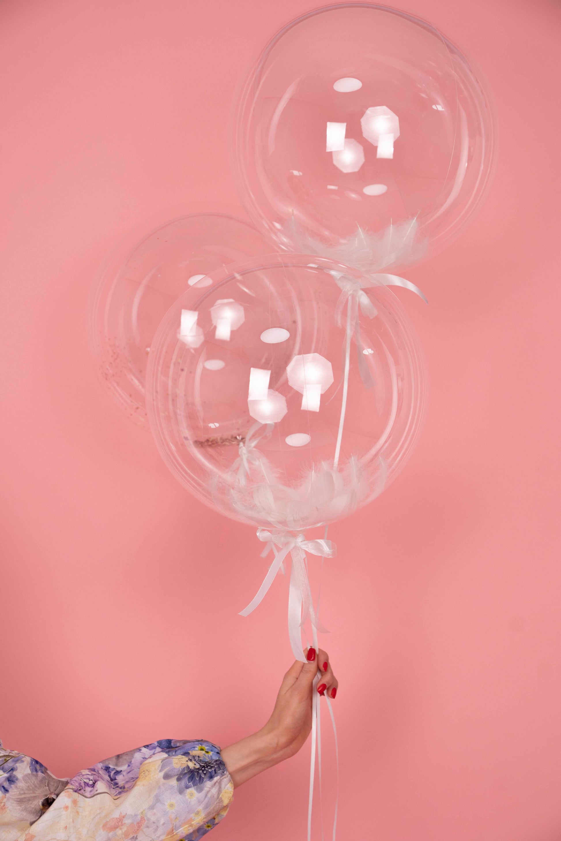 2 bubble balloons with feathers inside