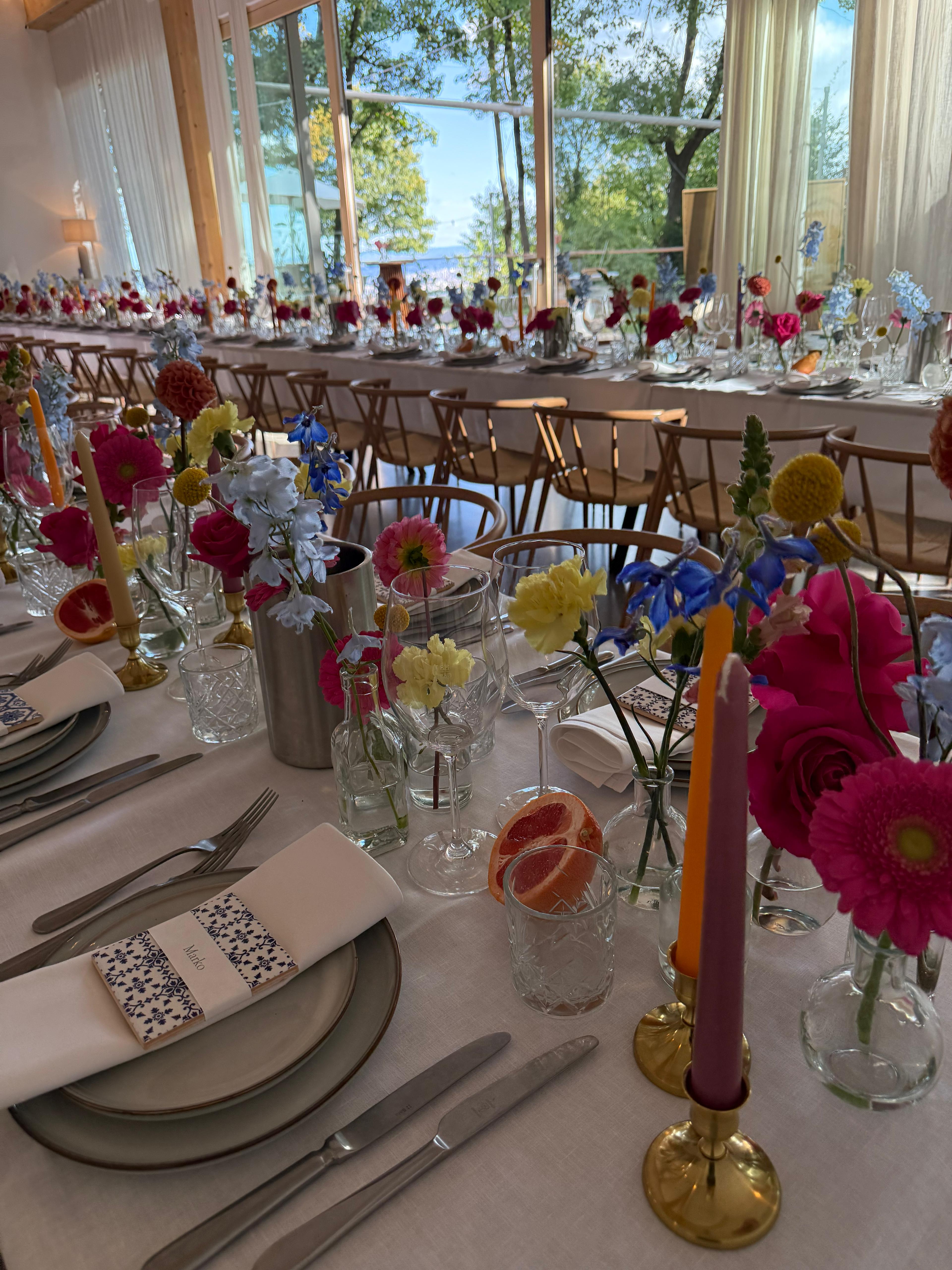 Familiäre Atmosphäre und elegante Optik. Durchgehende Blumenarrangements schaffen beeindruckende Tischlandschaften. Perfekt für Schloss-Hochzeiten.