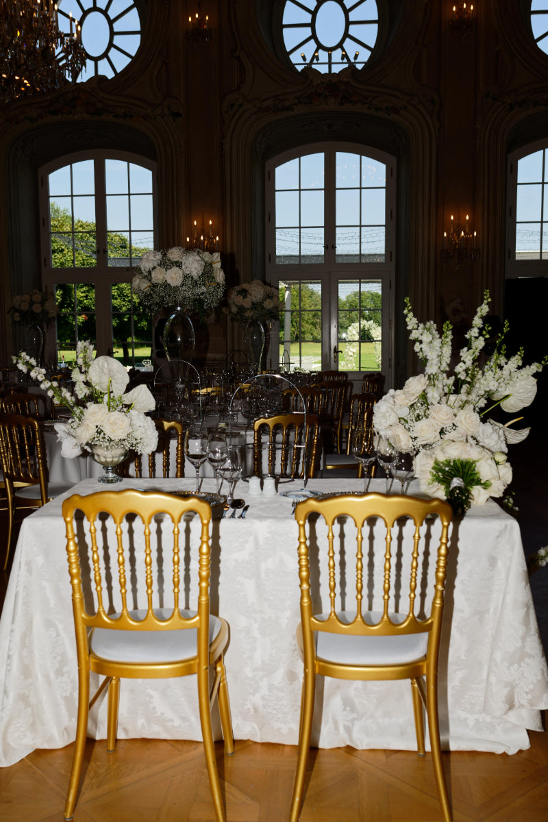 Opulente weiße Orchideen und Lilien in Kristallvasen, goldene Charger-Plates und mehrstöckige Centerpieces. Glamouröse Eleganz für gehobene Locations.