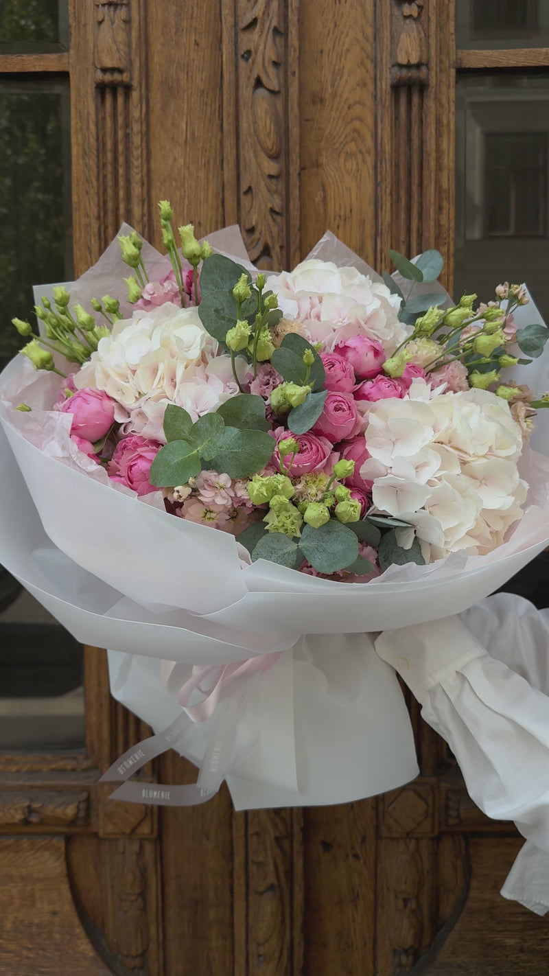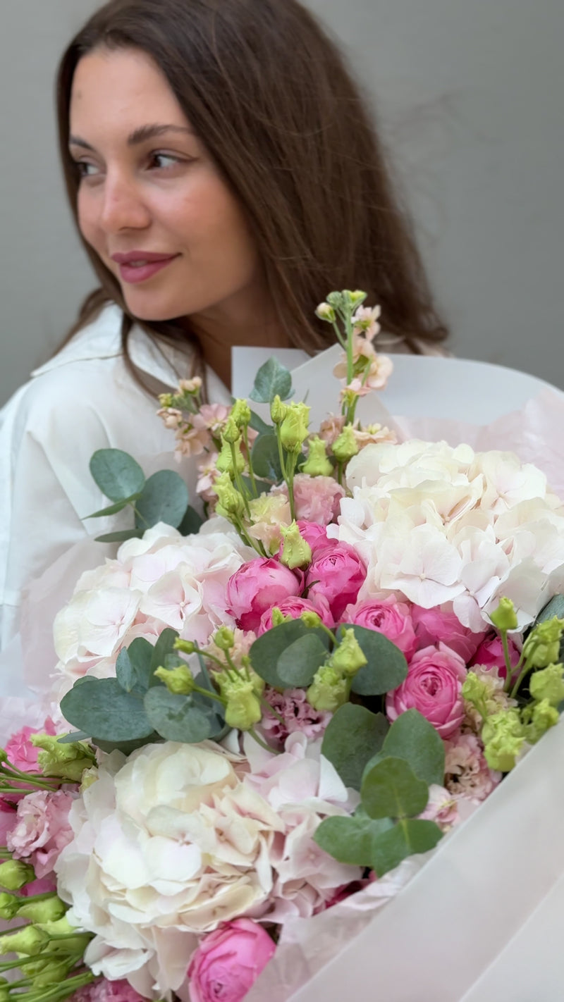 Hydrangea, spray roses, lisianthus
